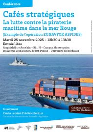 Le second café stratégique de cette année universitaire aura lieu mardi 25 novembre prochain de 12h à 13h (collation offerte pour les étudiants) sur le Campus de Pessac (amphi Asselain) et l'invité sera le Contre-amiral Frédéric Bordier, Commandant de Marine en Nouvelle-Aquitaine. Il interviendra sur le thème de la "lutte contre la piraterie maritime dans la mer Rouge".