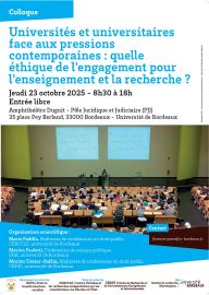 Colloque au PJJ à Pey-Berland le jeudi 23 octobre 2025, organisé par Marie Padilla, Marion Paoletti et Marion Tissier-Raffin, avec le soutien de la Fondation Mainguené et du département DETS, ainsi que du CERCCLE, du CRDEI, et de l'IRM. Dans un contexte dans lequel la science en général et les SHS en particulier sont frontalement attaquées, et dans lequel des chercheurs sont personnellement discrédités, voire menacés, nous organisons un colloque aux enjeux scientifiques et sociétaux majeurs et très actuels qui porte sur le thème suivant: quelle éthique de l'engagement pour la recherche et les universités? Les débats de la journée seront structurés en 2 temps: - D’abord, comment les chercheurs font face aux enjeux de valeurs dans la recherche ? - Puis, à quelles conditions les universités, en tant qu’organisations, peuvent-elles intervenir au sein du débat public? ».